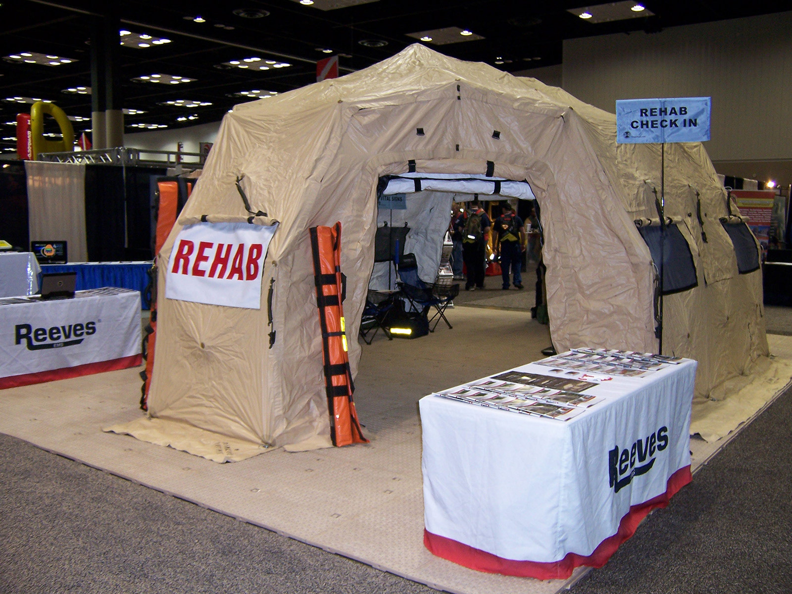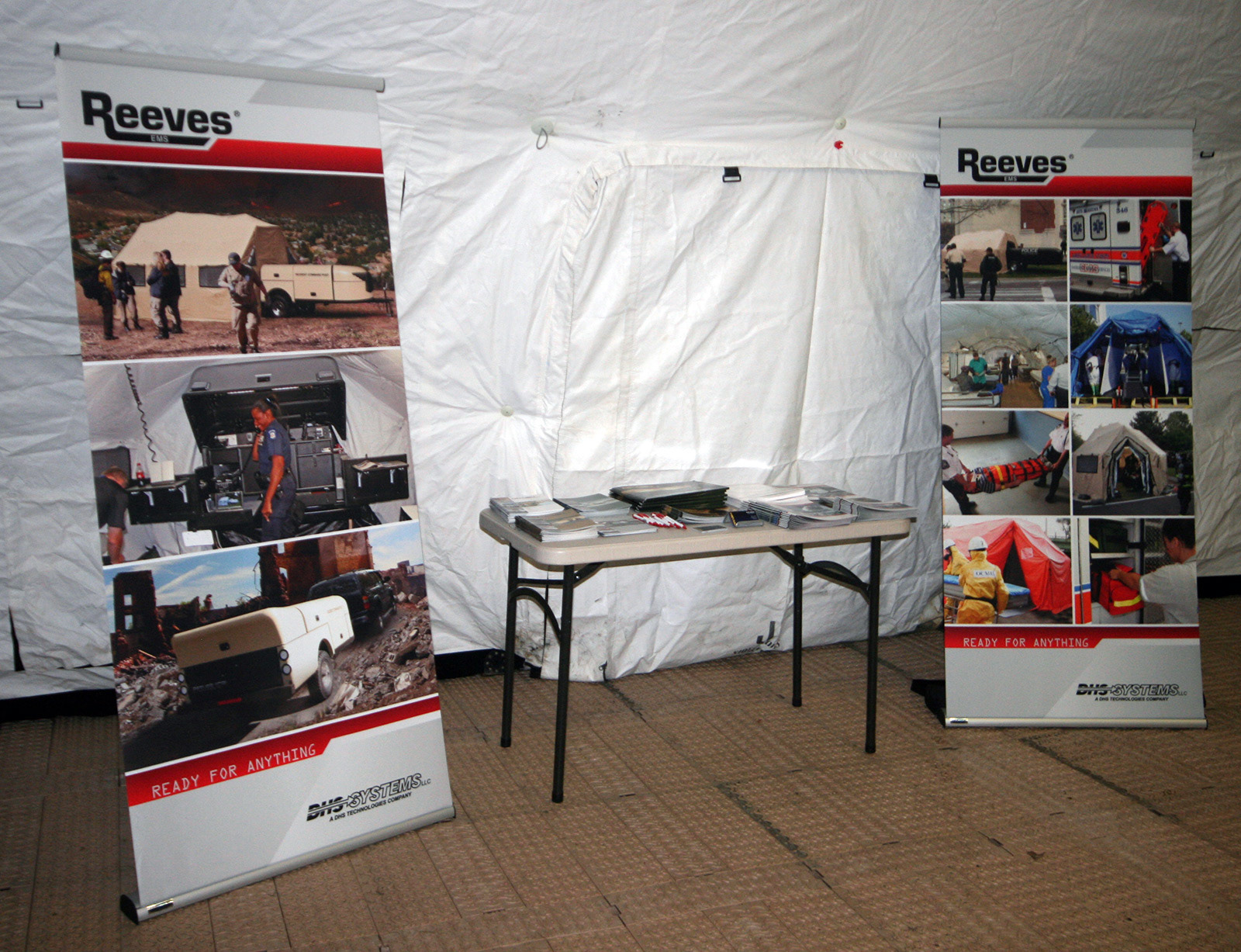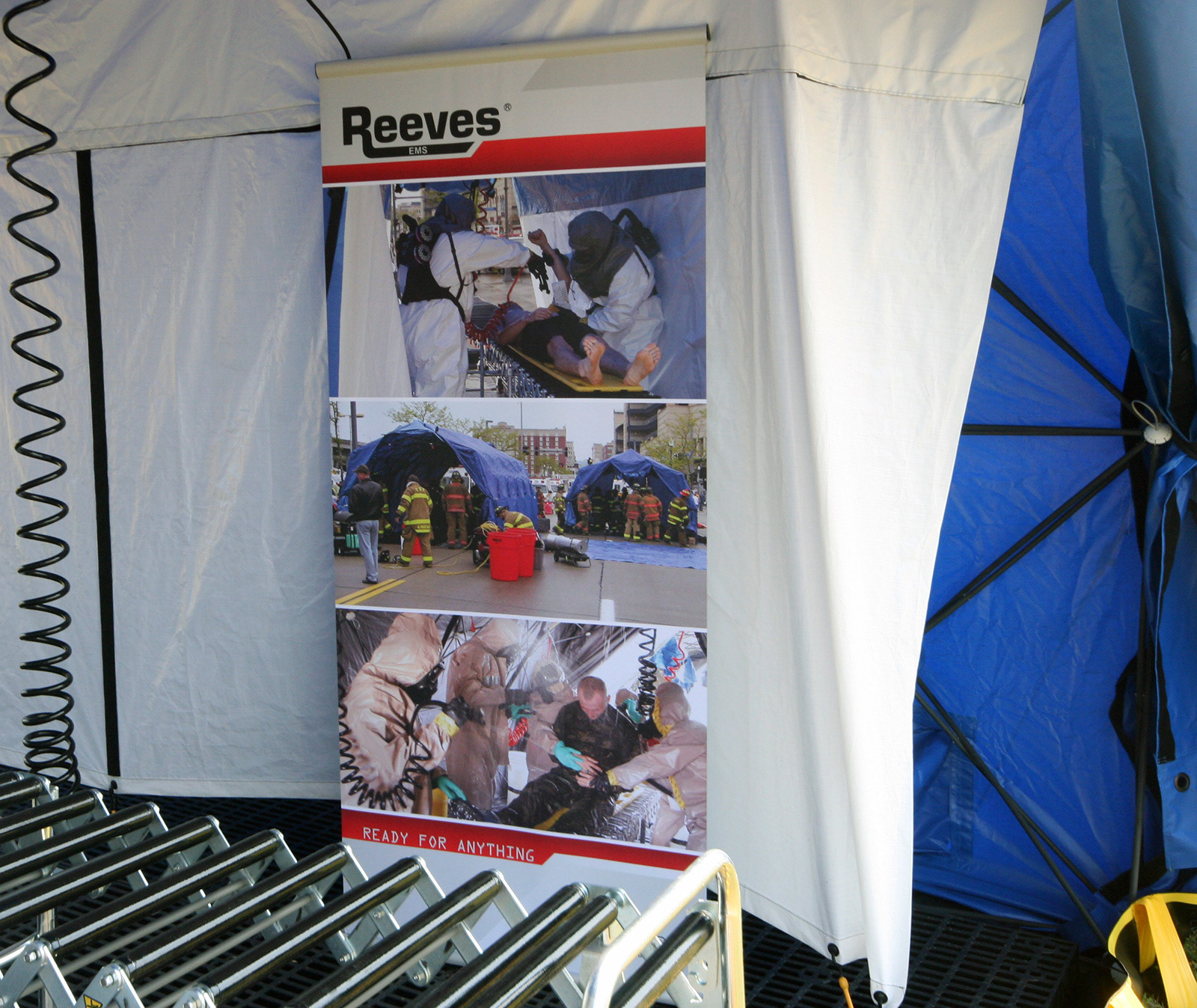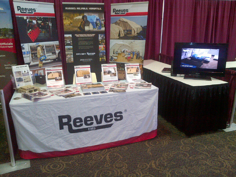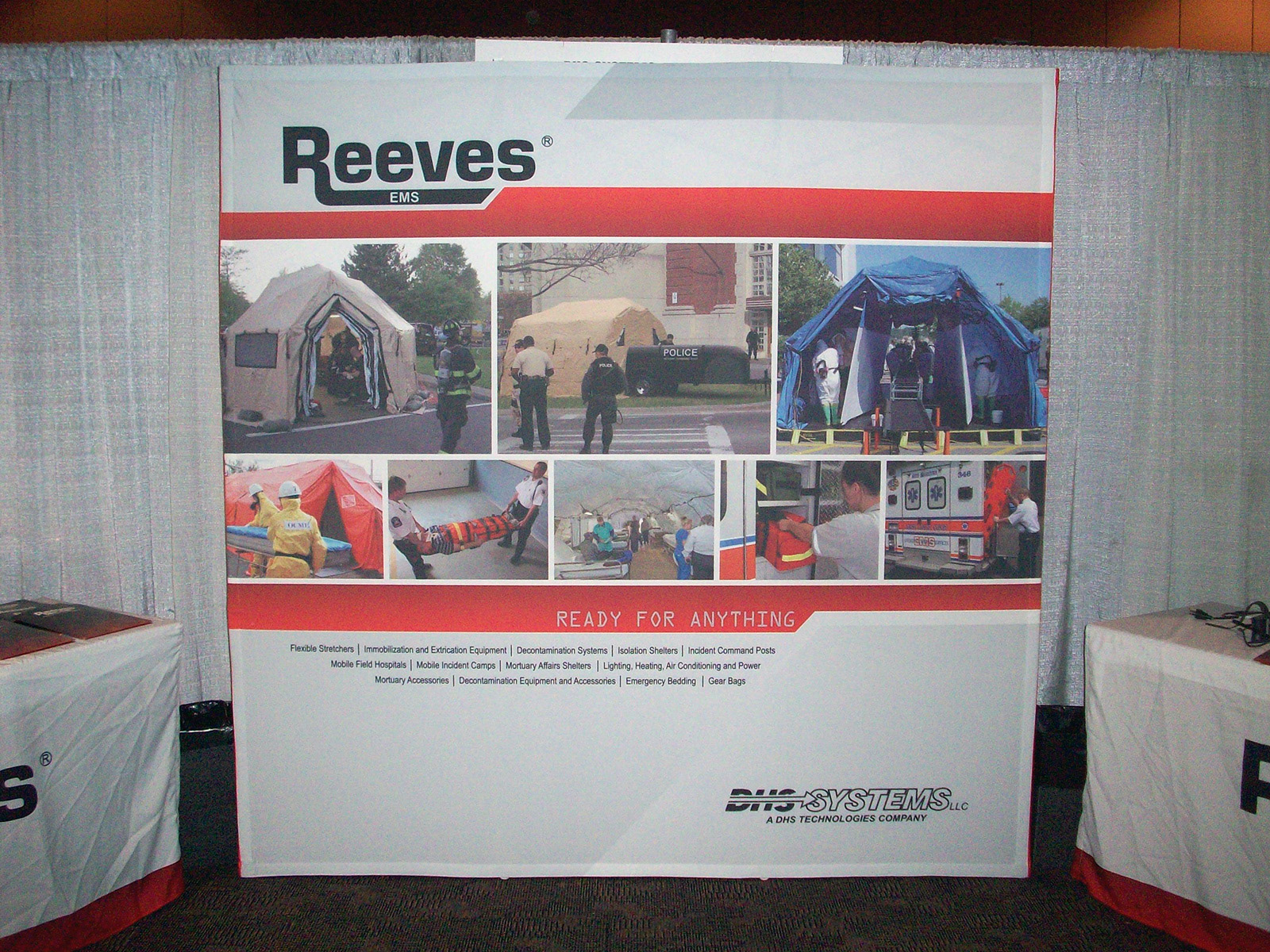 The displays below showcase large-format trade show graphics designed to support Reeves EMS presence at industry events, highlighting product visibility and brand consistency for governmental, municipal, and private organizations involved in emergency planning and response.