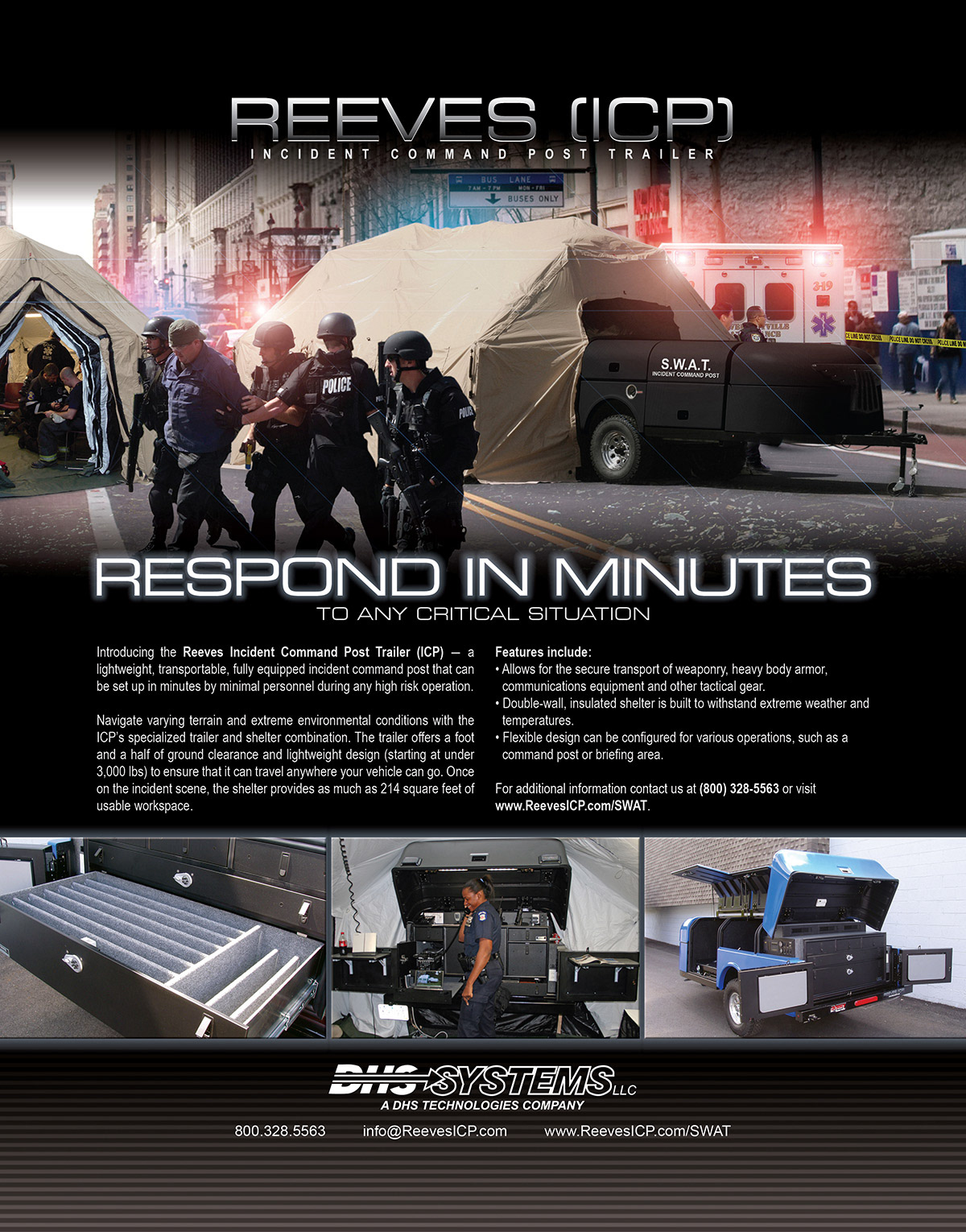 Reeves ICP (Incident Command Post) was a mobile shelter and trailer-based command system designed to support coordinated response for police, fire, EMS, and emergency management agencies during critical incidents. Built for rapid deployment, the system provided a centralized, climate-controlled command environment to improve communication, situational awareness, and operational control at active scenes, large-scale emergencies, and planned events.